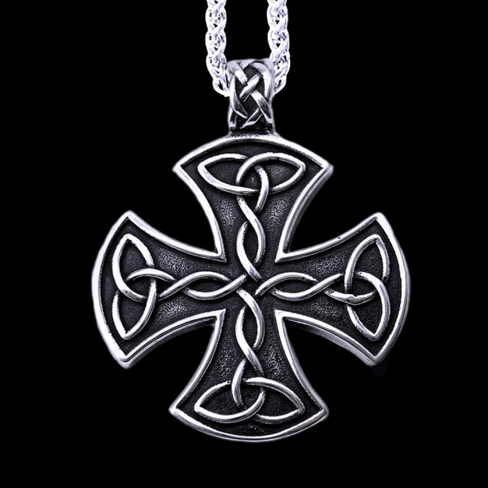 Přívěsek odlévaný z chirurgické oceli 316L ve tvaru tlapatého kříže, který je zdoben propleteným ornamentem Triquetra. Velikost kříže je 4,5 x 4,5 cm (bez závěsného očka). Závěsné očko pojme řetízek o maximální šířce (vnitřní průměr očka) cca 4,5 mm. Z druhé strany je přívěsek krásně hladký (zrcadlově leštěný viz foto č.2). Přívěsek lze objednat jak bez řetízu, tak případně s řetízkem (dle výběru).