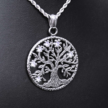 Přívěsek z leštěné chirurgické oceli, strom života, který je osazen kameny čiré barvy. Velikost přívěsku (průměr kruhu): 3,7 cm. Vnitřní velikost závěsného očka (maximální doporučená šířka řetízku): 4 mm. Přívěsek lze zakoupit s řetízkem nebo bez něj. Řetízek je o síle 2 mm a lze jej zvolit v délce dle výběru v kolonce: DOSTUPNÉ VARIANTY.